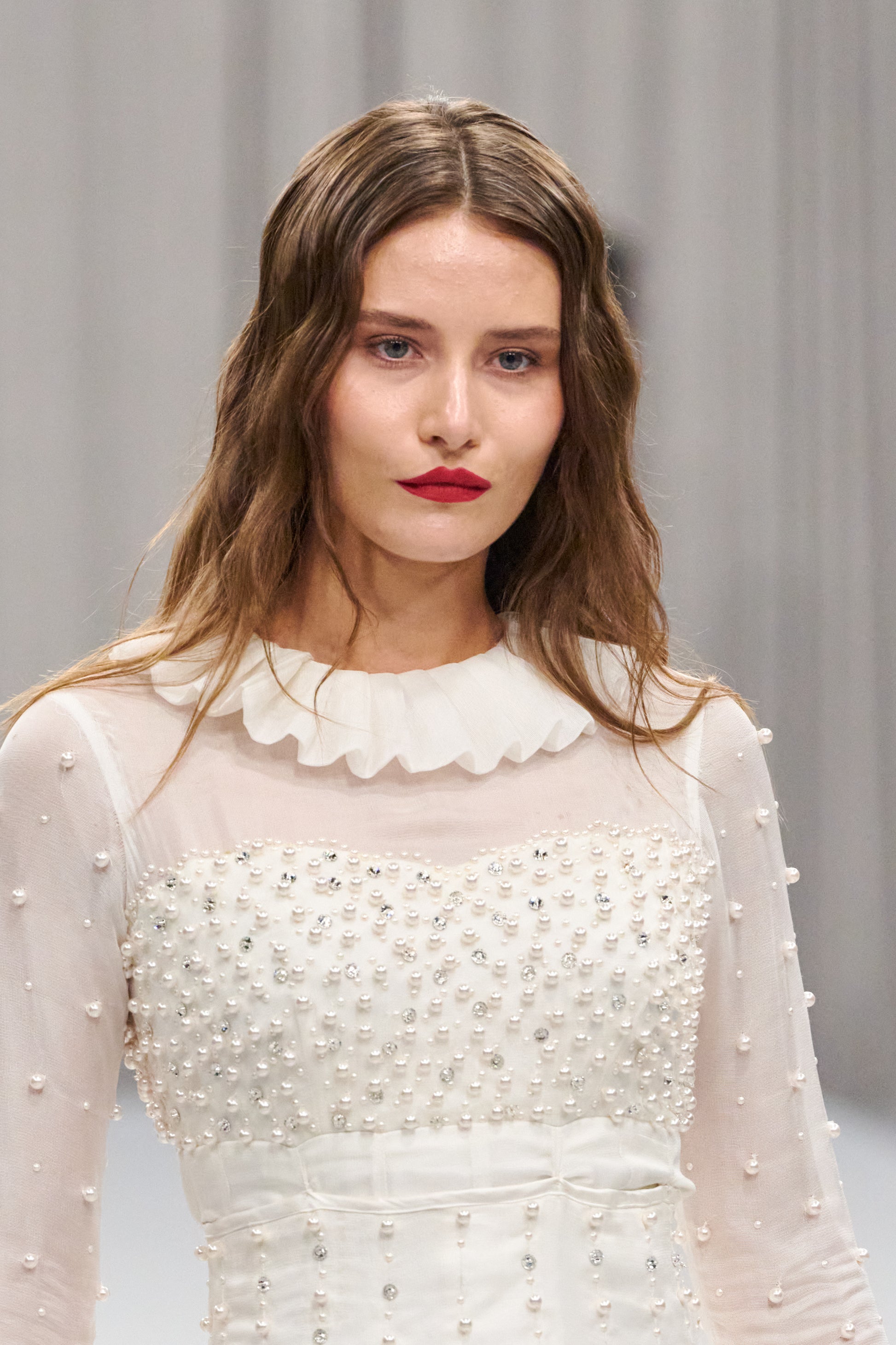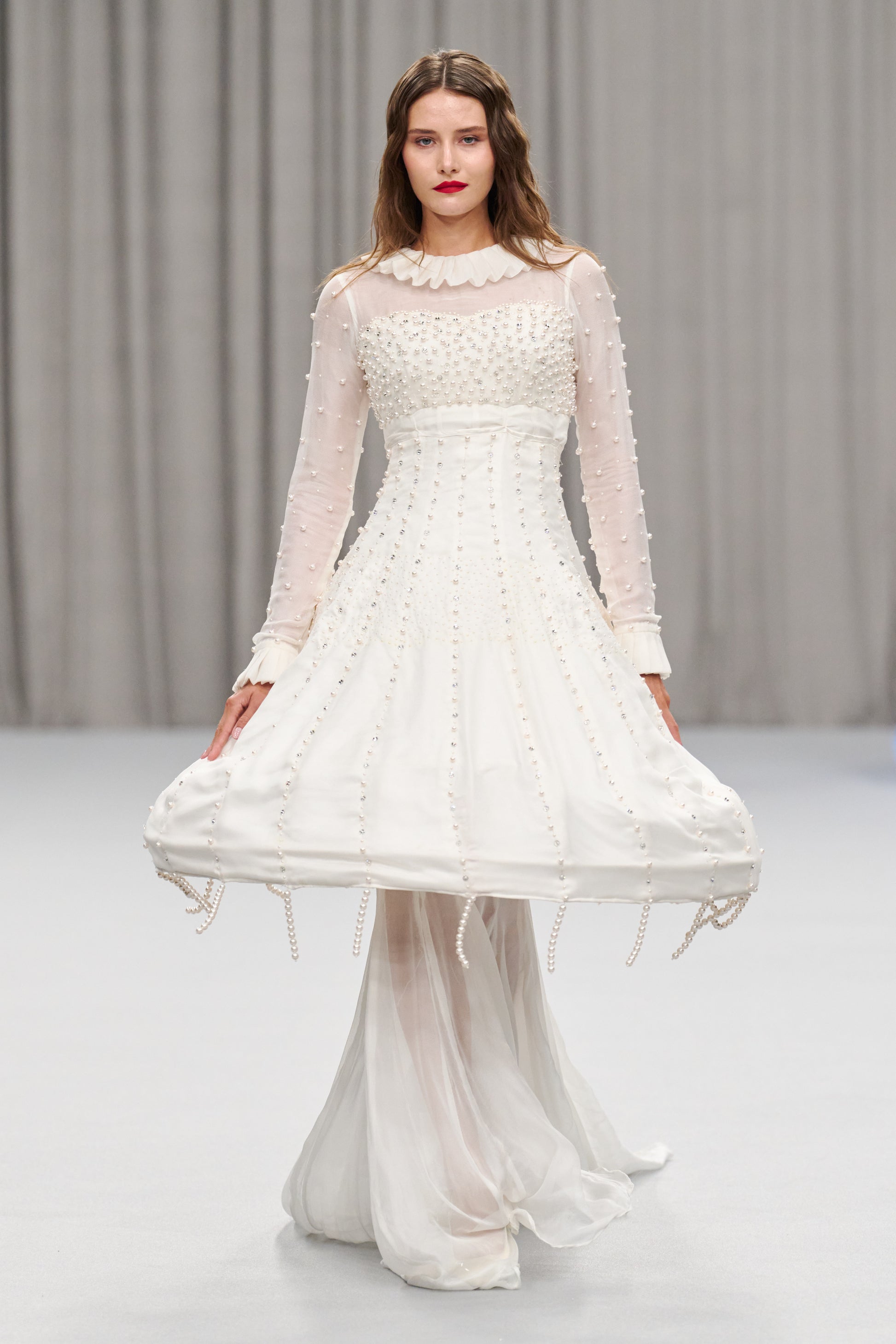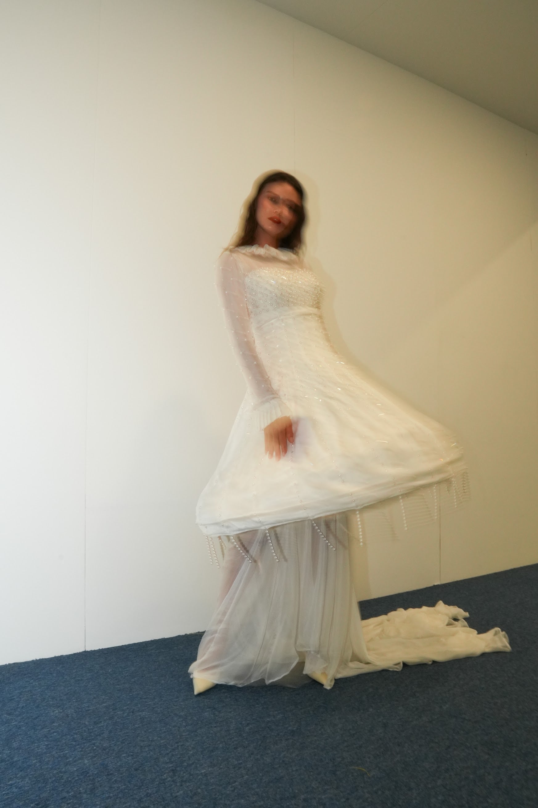 The design is distinctive, featuring long, sheer net sleeves with pearl detailing, a high neckline with a delicate ruffle, and a sculpted taffeta overskirt with a whimsical suspended pearl/bead trim that reveals a flowing silk net skirt beneath. This is an unparalleled choice for the most memorable and exclusive events.