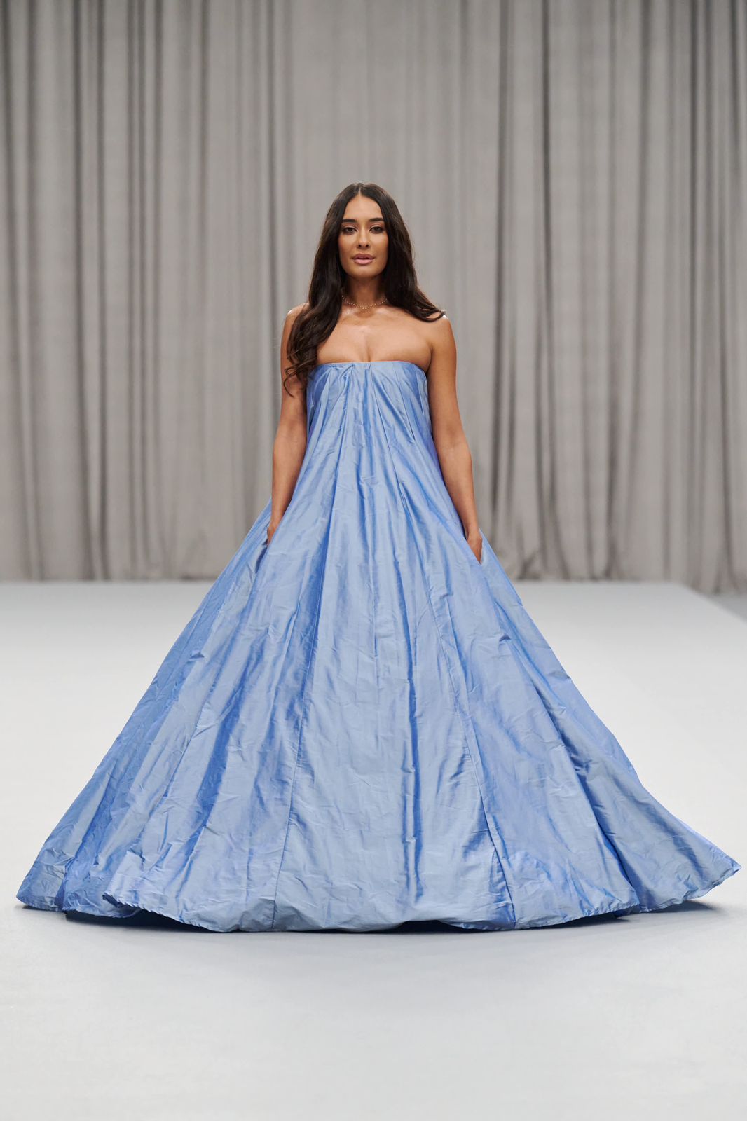 This dress commands attention with its vibrant Electric Blue hue and immense, sweeping volume. Crafted from luxurious 100% Taffeta Silk, the gown retains its remarkable, grand shape and possesses a beautiful, soft sheen. It features a classic strapless sweetheart neckline and flows into an extraordinarily voluminous, pleated skirt that creates a truly cinematic silhouette.