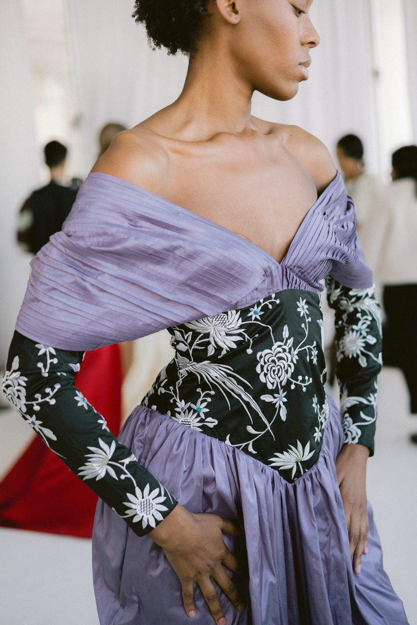This is a striking and elegant garment with a structured bodice and voluminous draping. The design features a deep off-the-shoulder neckline with pleated detailing, paired with long embroidered sleeves and a corset-like waist section. The fabric choices, including the soft lilac and black floral Parsi embroidery, create a sophisticated contrast. The draped skirt adds movement and fluidity, making it both regal and contemporary.