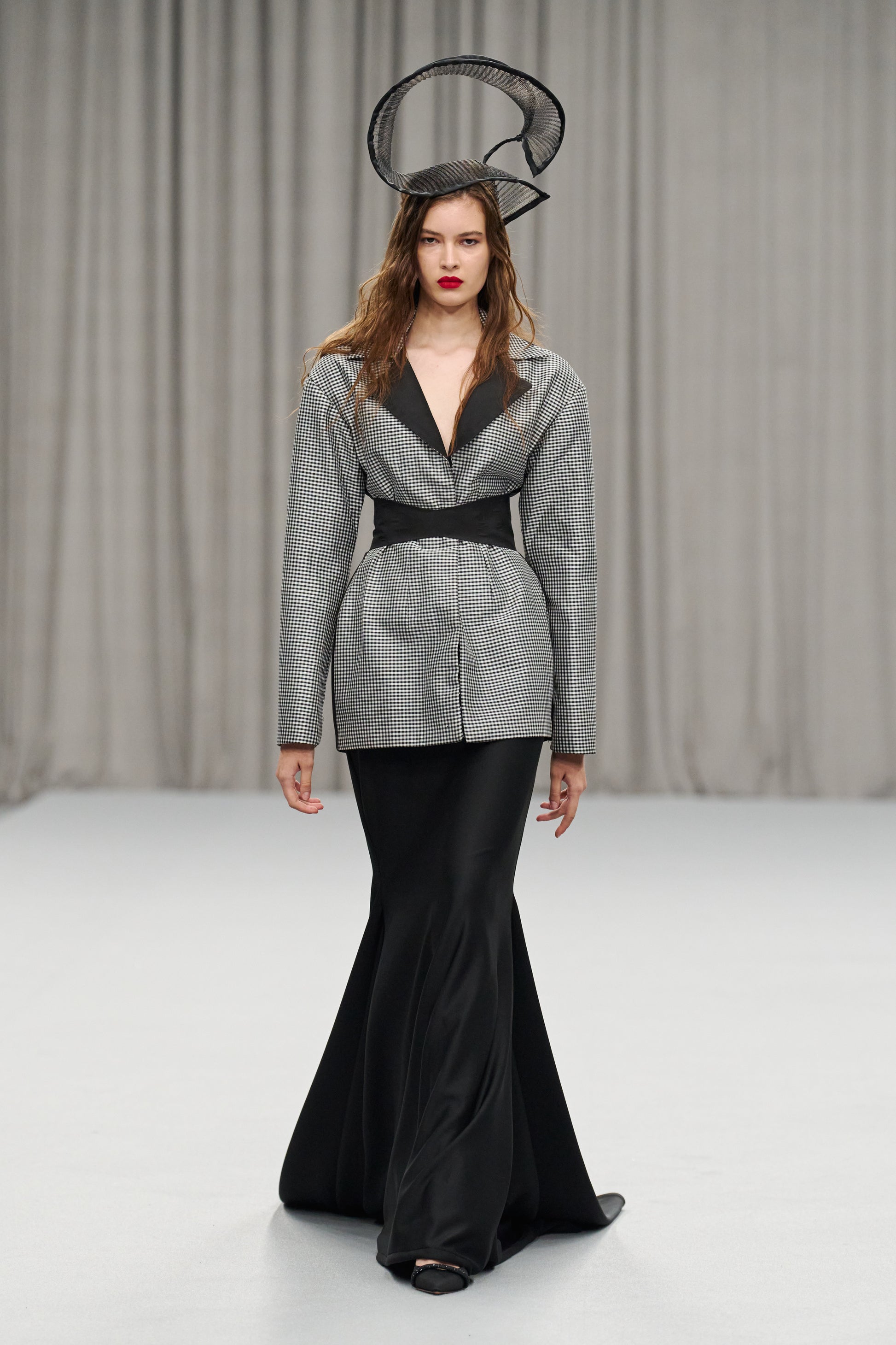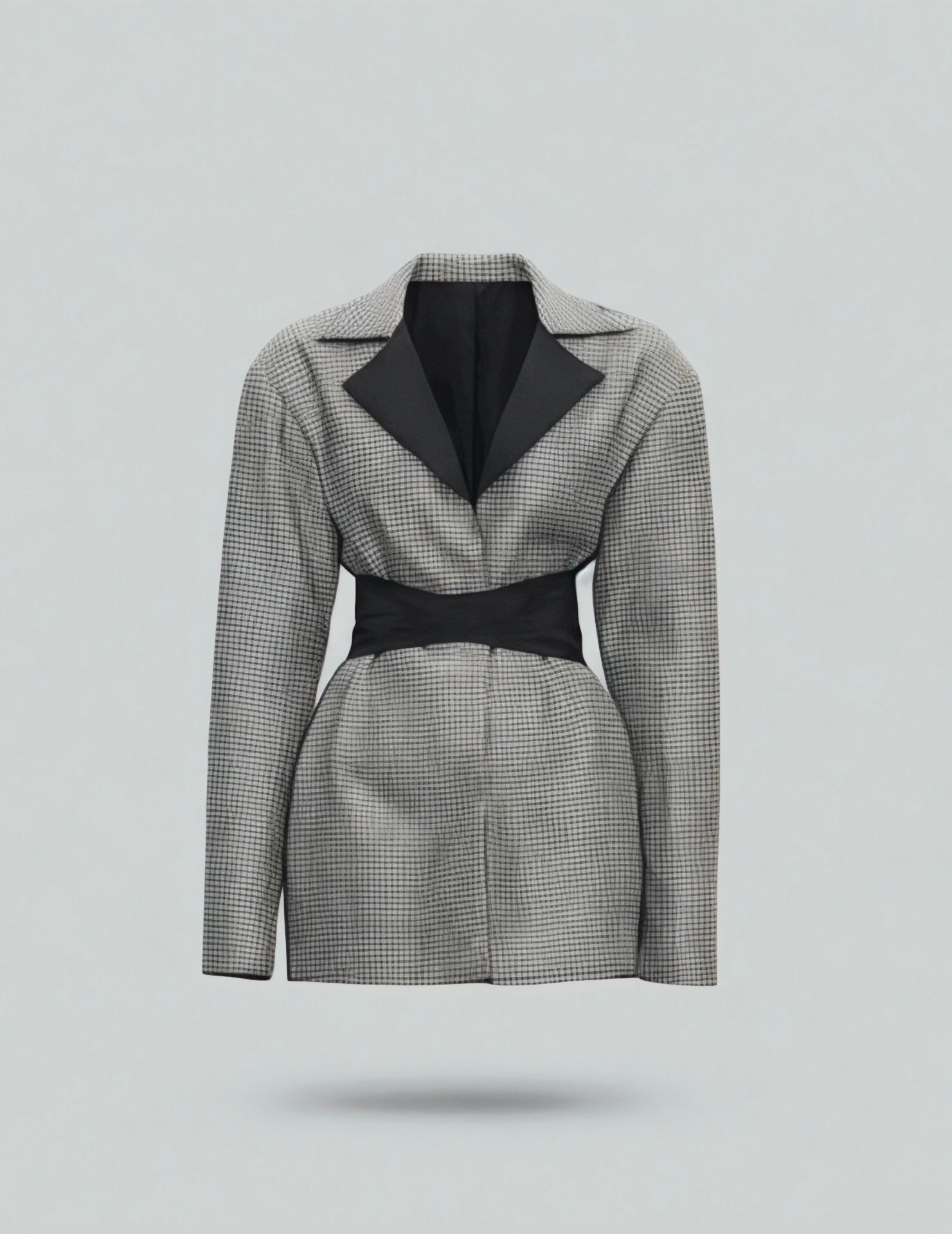 A cosmic interplay of power and elegance, this look fuses tailored precision with dramatic flair. The structured blazer with a contemporary hourglass shape, defined by a contrasting black cinched waist panel that accentuates the figure.