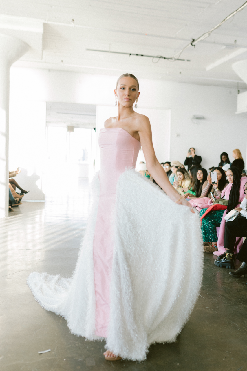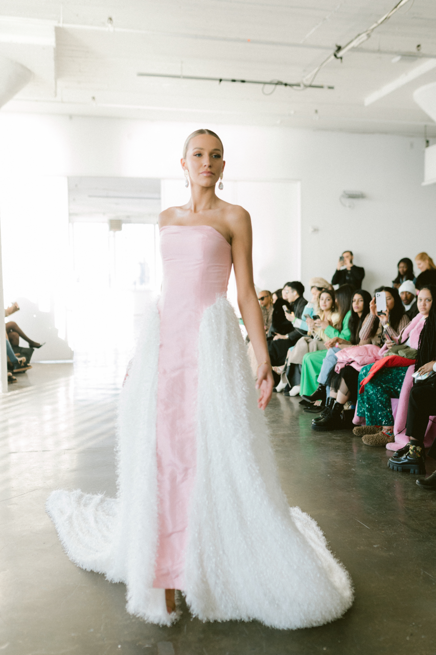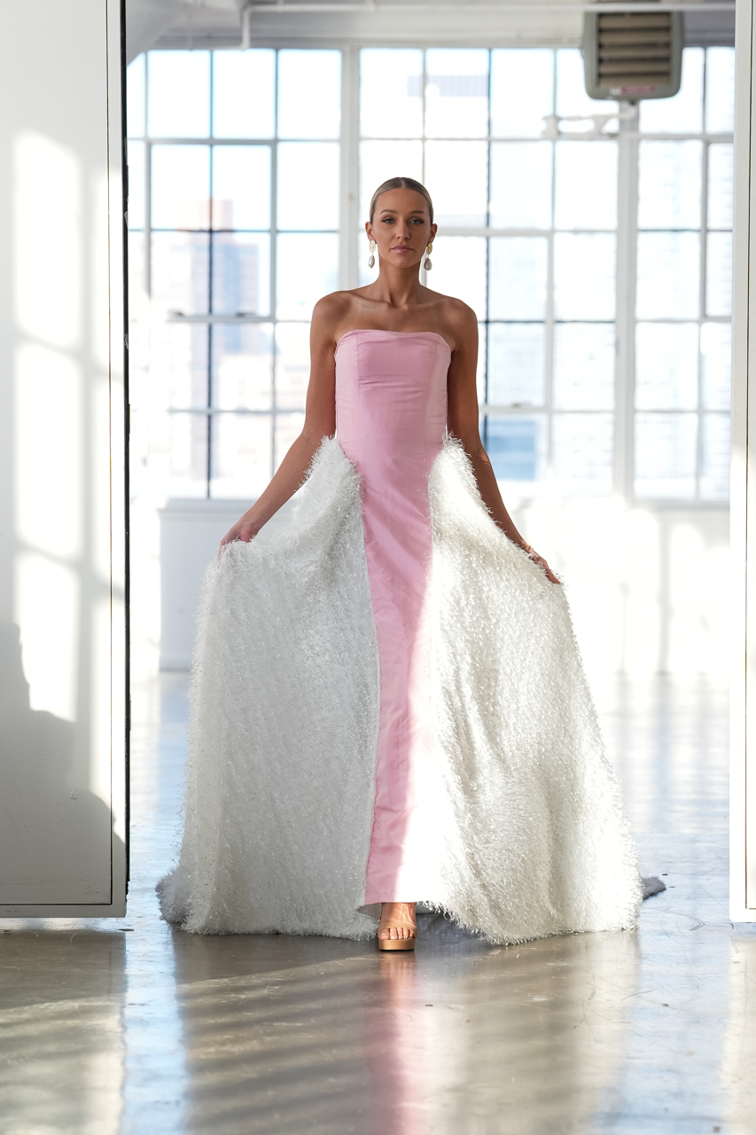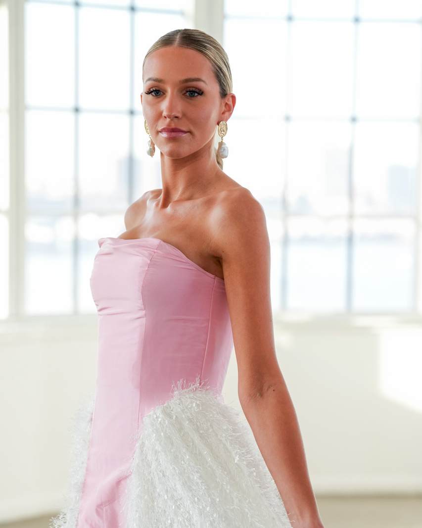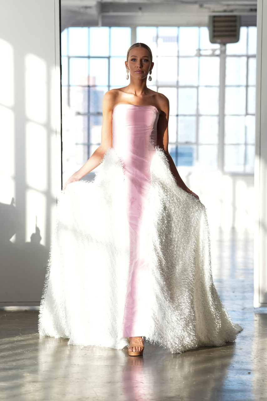 A breathtaking blend of softness and structure, this gown from the Nocturnal Collection is crafted from luxurious pink taffeta, sculpting a sleek, strapless silhouette. Cascading panels of delicate white feathers envelop the skirt, creating fluid movement and a dreamlike aura with every step. The contrast between the structured bodice and the airy, textured feathers evokes a sense of hidden beauty—graceful, yet quietly powerful.