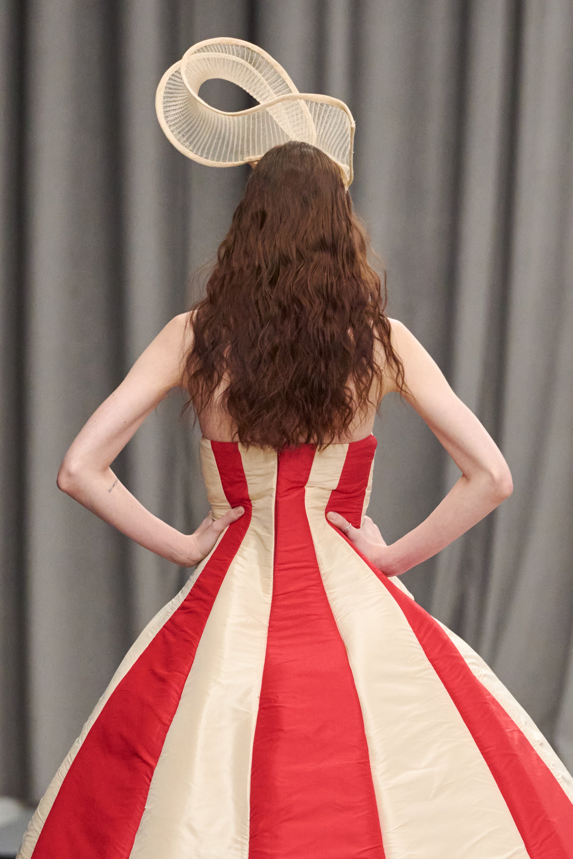 Crafted in handcrafted quilted fabric. A striking strapless ball gown featuring bold vertical red and ivory stripes. The structured silhouette flares dramatically from a fitted bodice into a voluminous skirt. Crafted from lustrous taffeta, it exudes both elegance and architectural flair. The look is completed with a sculptural statement headpiece.